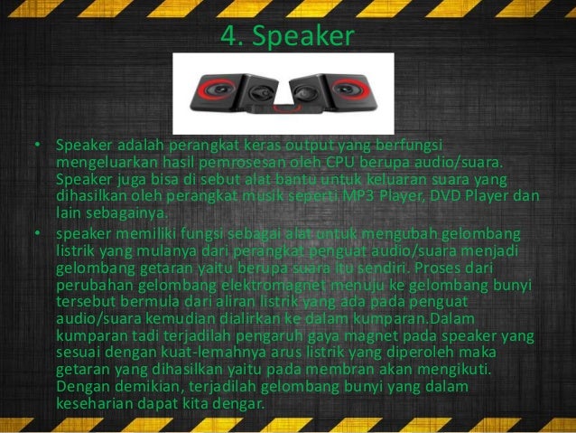Speaker adalah perangkat keras output yang berfungsi mengeluarkan hasil pemrosesan oleh cpu berupa audio/suara. Output device (perangkat keluaran) output device output device, adalah perangkat komputer yang berguna untuk menghasilkan keluaran output device output device bisa diartikan sebagai peralatan yang berfungsi untuk mengeluarkan hasil pemrosesan ataupun pengolahan data yang. Biasanya speaker selalu digunakan di warnet, dn tempat tempat yang menyewakan komputer untuk bermain game. :) pertanyaan baru di ti. Output device atau yang dalam bahasa indonesia biasa disebut dengan perangkat keluaran adalah komponen atau peripheral komputer yang berfungsi untuk menampilkan data yang telah diolah dari input device yang tealah di process device baik dalam bentuk hardcopy maupun softcopy.